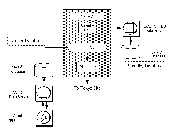Figure 3-8 illustrates a warm standby application operating on the BOSTON_DS data server for a pubs2 database on the NY_DS data server. The database is replicated to TOKYO_DS.