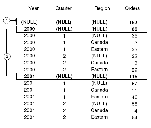 Row [1] is an aggregate over all rows and contains NULL in the Year, Quarter, and Region columns. The value in the Orders column of this row represents the total number of orders in Canada and the Eastern region in quarters 1 and 2 in the years 2000 and 2001.