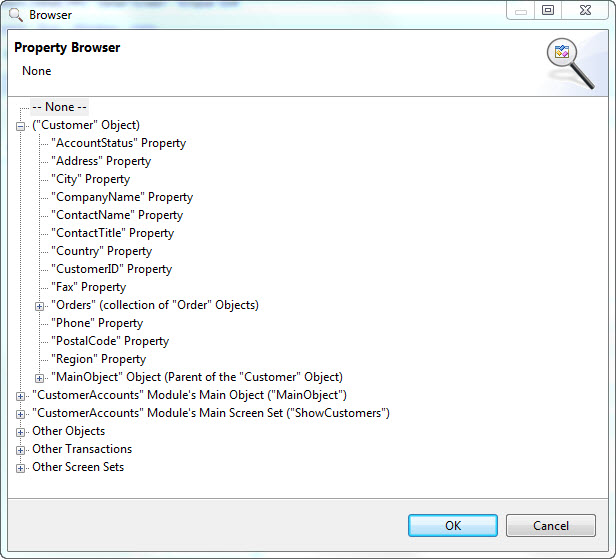 In this example the target object property of an edit transaction property is being set. The object in context is the object to be modified by the transaction. In the Property browser, the Customer object is displayed as the first root node and is expanded, as shown in the above example. If the proper option for selection is one of the properties under the Customer object, then it is likely that the Property Browser is not needed, as in almost all contexts the properties of the customer object would be displayed in the context menu of the attribute.