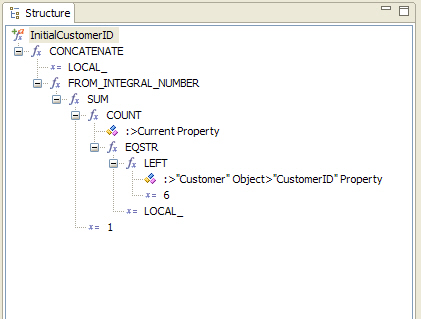This example is taken from the rule editor and is one of the components of that tool provided to developers for the purpose of defining a rule. In this example, the rule itself is represented by the root node of the tree control, which is named InitialCustomerID. As the only child node to this root is a function call to the function CONCATENATE. This function concatenates two or more string values, returning the result. The strings to concatenate are provided as parameters to the function.
