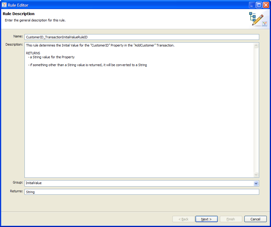 2. Set the Name and Group attributes as desired for the new rule definition. The Description field may also be edited. The default text display is based on how the rule is to be used. The Returns field is read-only and specifies the data type of the value to be returned by the rule when it is evaluated. Click the [Next >] button to advance to the Rule Editor.