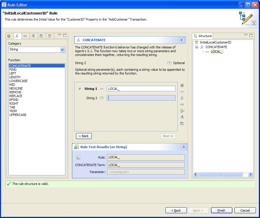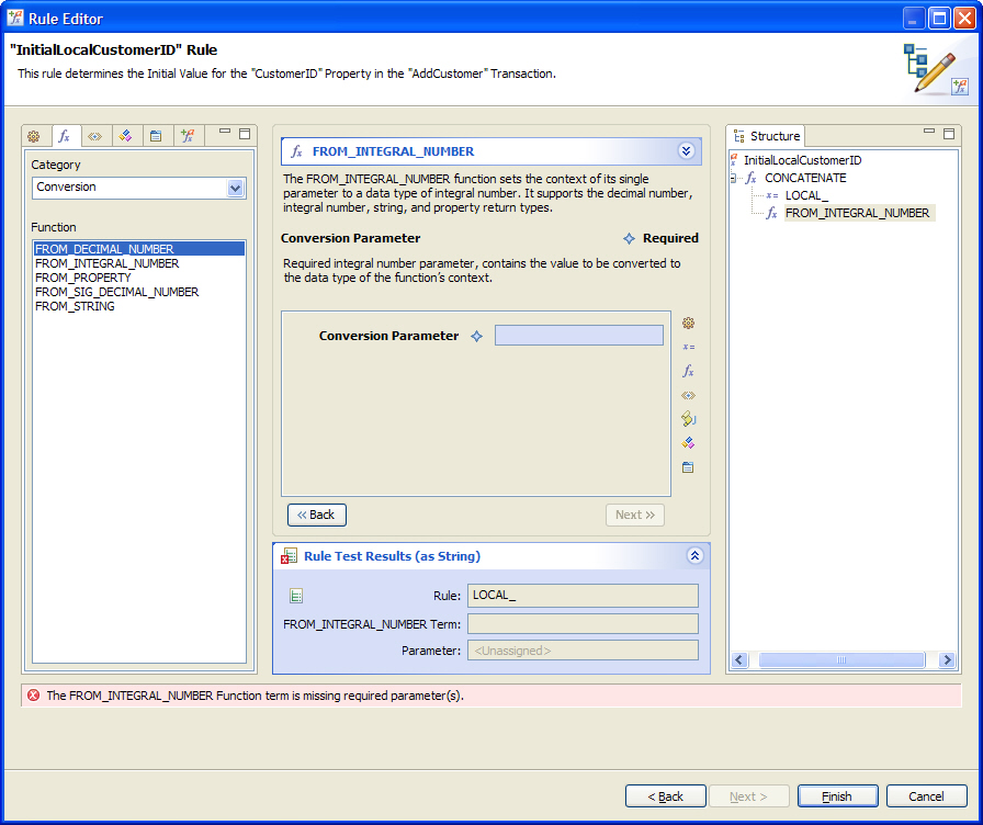 Note the structure view to the right of the rule editor. As functions are added, their position within the overall rule structure is represented. This structure view can be used in the definition of the rule as well. Right-clicking on any function in the rule structure displays a popup menu allowing for the addition of parameters to this functions. The menu also provides options to replace terms and delete them. Additionally, terms may be dragged and dropped to different locations within the structure if it is desired to modify the rule in this manner.