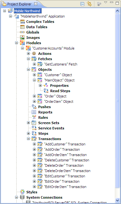 The Project Explorer View is a part of the core Eclipse platform that is used by the Agentry Editor plug-in. In general, this view displays projects saved within the current Eclipse workspace. These projects are displayed in a tree control, with each root node representing one of the projects. For the Agentry Editor, the Agentry application projects within the current workspace are listed here as well.