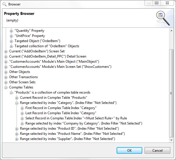 The Property Browser provides several options for selecting a record from a complex table. Ultimately a specific field from the selected record is returned in almost all contexts. The specific field is a part of the target path created using the Property Browser. The selection criteria for the record can be based on one of the indexes defined within the complex table. When using an index, the first record, last record, or one selected by performing a search based on that index are all options. Searching on indexes in a complex table using a target path also includes support for parent-child indexes, if they are defined.