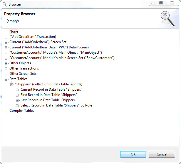 The Property Browser presents several options to select a record from a data table. The resulting target path created typically returns one of the two field values from the record, either the code or value. In some cases it may return the record, depending on the context in which the path is evaluated.