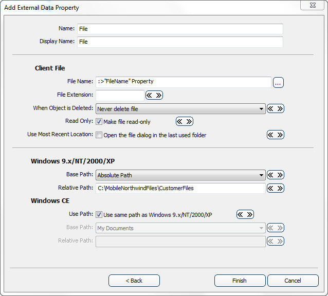 5. Next the external data property is defined. This property provides the reference to the file as stored on the client device. Begin by adding a property to the object with a data type of External Data. In this example the property is named File. Set the attributes of this new property according to the following: