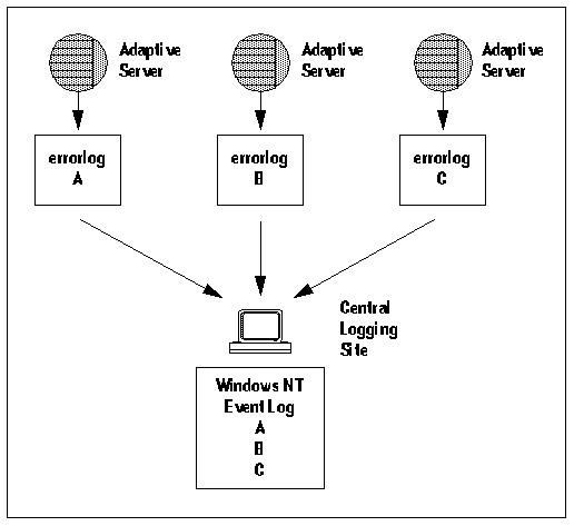 You can record messages from multiple Adaptive Servers in the Windows event log of a central, network computer. The recording computer does not need to run Adaptive Server.
